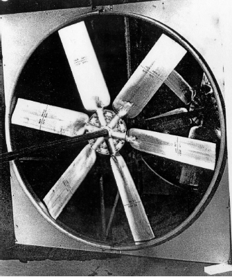 به موقعیت فن ها، نازل های اسپری رطوبت و کویل ها توجه شود. سپر های فوقانی و تحتانی، هوا را با فشار میان لایه های الوار هدایت می کنند.